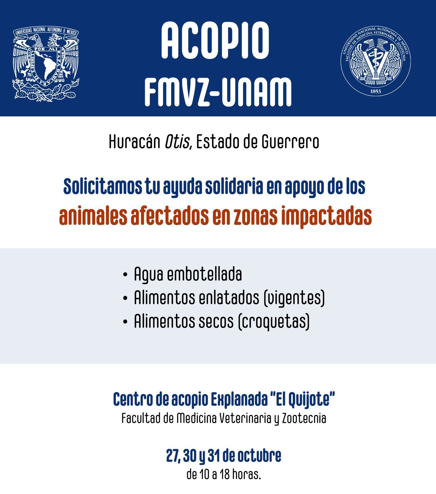 Por medio de sus redes sociales, la Facultad de Medicina Veterinaria y Zootecnia de la UNAM (FMVZ-UNAM) lanzó una convocatoria para solicitar alimento y agua para los perros y gatos que también fueron afectados por el huracán Otis en Guerrero.