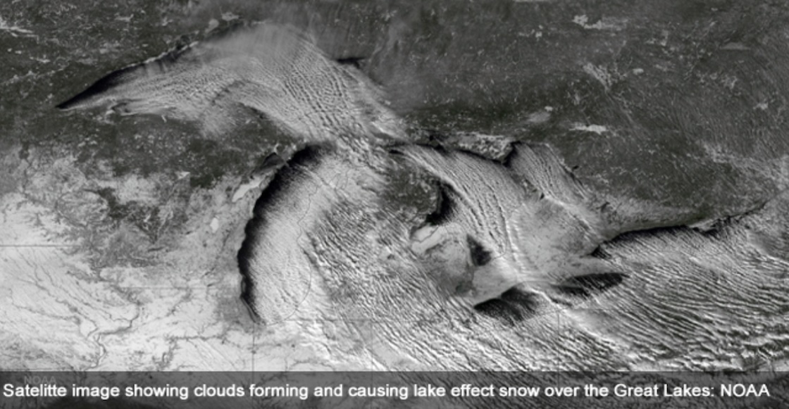 El Servicio Nacional de Meteorología (NWS) de Estados Unidos explica que en tanto el aire frío recorre las aguas no congeladas o relativamente cálidas de los Grandes Lagos, el calor y la humedad pasan a la parte más baja de la atmósfera.
