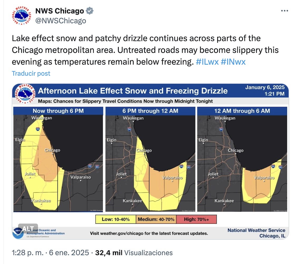 En el caso de Chicago, el 5 de enero el NWS avisó de la nevada por el efecto lago en el área metropolitana de Chicago, aunque no fue la única zona, pues las nevadas se registraron en Nueva York, Pensilvania y hasta Ohio.