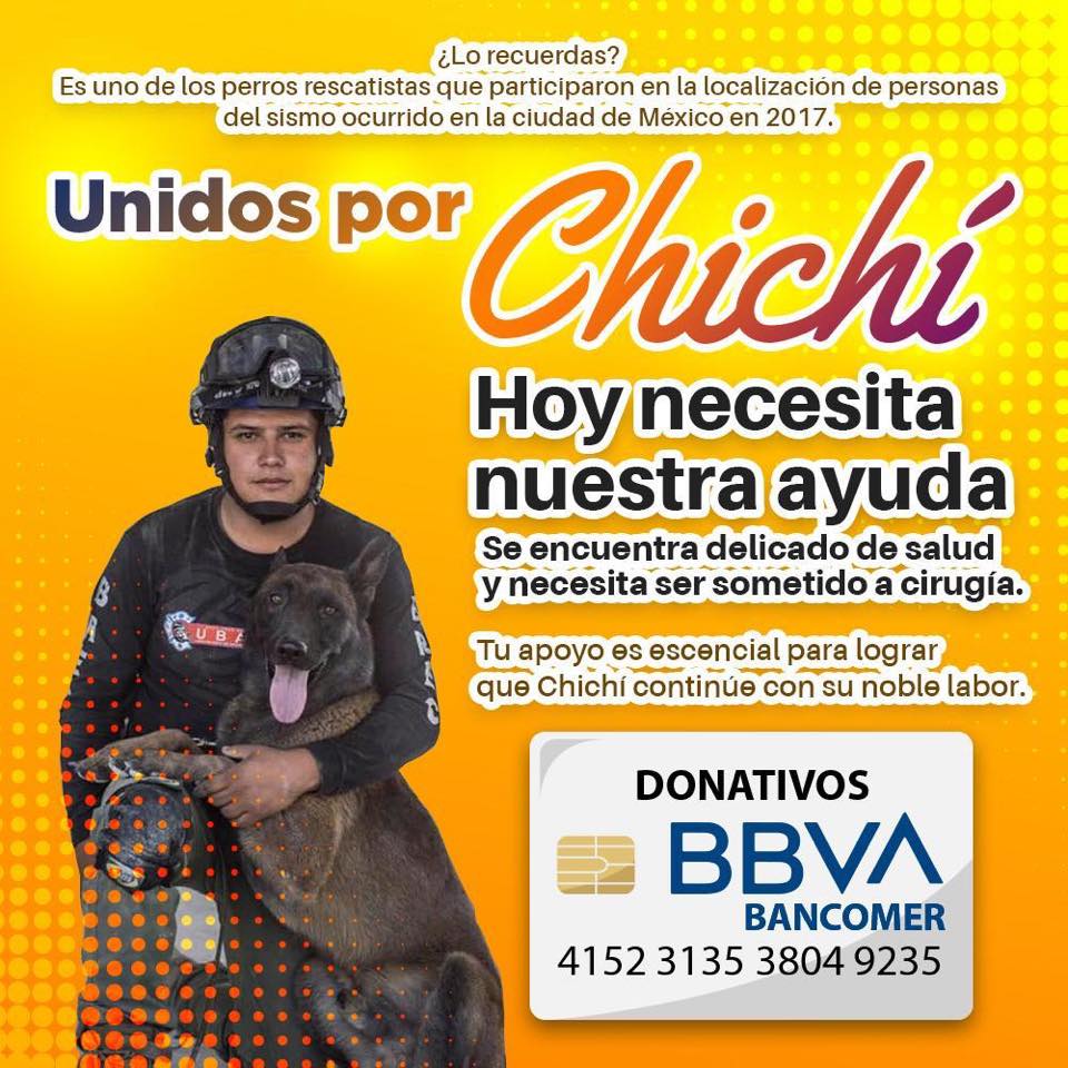 A través de redes sociales se dio a conocer que el pastor belga se encuentra inmovilizado gracias a una lesión cervical en un tendón, la cual le impide realizar sus movimientos con normalidad. Por ello su dueño y compañero de rescate, Luis Campos, ha pedido a la bella comunidad de internet que lo ayude a poder solventar los gastos médicos de Chichí, quien necesita estudios, una operación y quien además no cuenta con ningún tipo de apoyo económico debido a que no pertenece a la Marina de México.