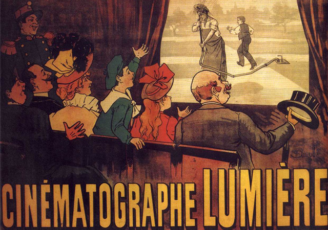 (El 28 de diciembre de 1895, en el salón Indio del Gran Café de París, proyectaron su primera película, Salida de la fábrica Lumière y el cinematógrafo comenzó a darle la vuelta al mundo).