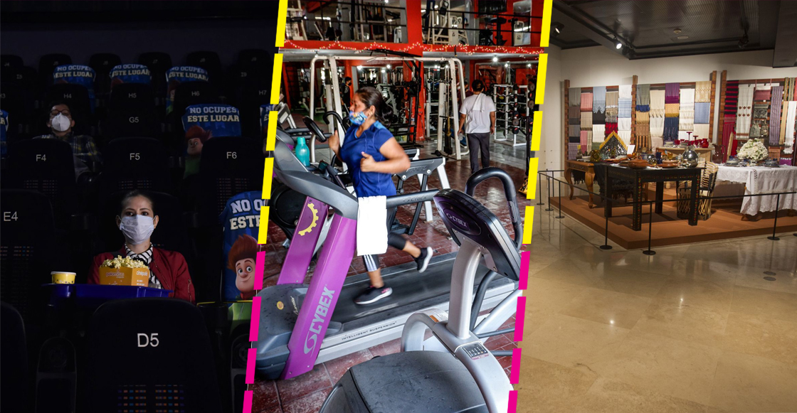 En el caso de los cines y teatros, el aforo máximo permitido será del 20% al interior con la última función a las 20:00 horas. Además, como en todas las actividades, es necesario el uso de cubrebocas todo el tiempo así como las medidas adecuadas de ventilación y filtros en el aire acondicionado.