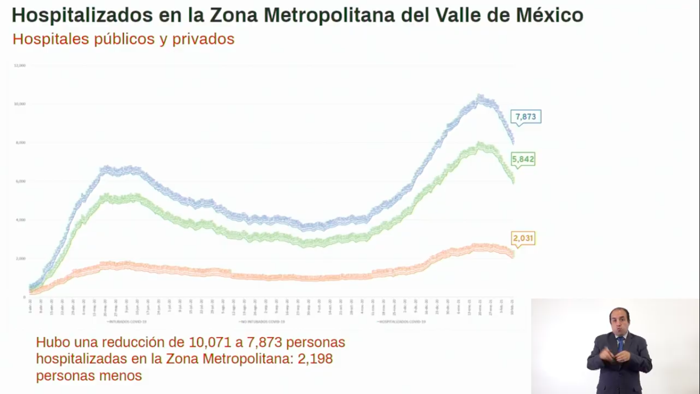 En la Zona Metropolitana del Valle de México se registra una ocupación total 7 mil 873 camas, lo que significa una reducción del 22% con respecto al pico máximo registrado en las primeras semanas de enero.