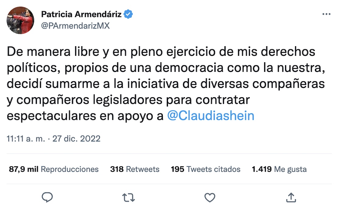 Por ejemplo, aquí el mensaje de la también empresaria Patricia Armendáriz: “De manera libre y en pleno ejercicio de mis derechos políticos, propios de una democracia como la nuestra, decidí sumarme a la iniciativa de diversas compañeras y compañeros legisladores para contratar espectaculares en apoyo a Claudia Sheinbaum”.