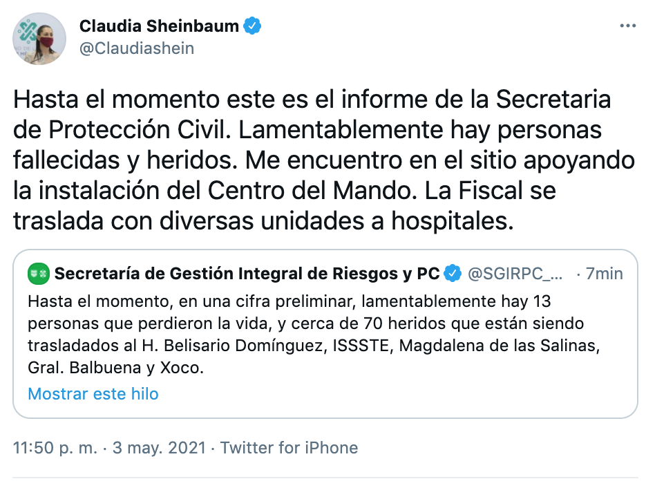 **Actualización: en conferencia de la jefa de gobierno de la Ciudad de México, Claudia Sheinbaum, la titular de la Secretaría de Gestión Integral de Riesgos y Protección Civil de la Ciudad de México, Myriam Urzúa Venegas, informó que el número de muertos por el colapso en la Línea 12 subió a 24 personas sin vida.
