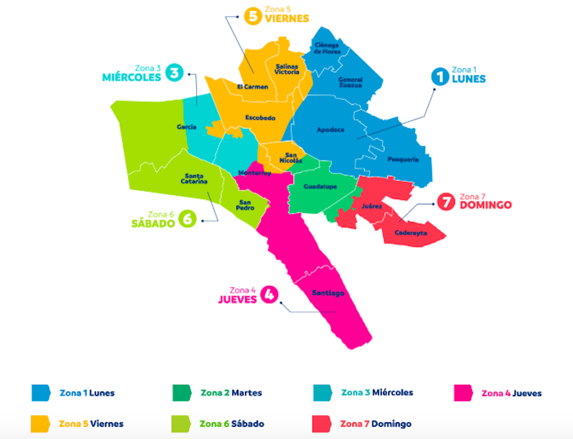 - Lunes: Zona 1 (Ciénega de Flores, General Zuazua, Apodaca, Pesquería y Escobedo)