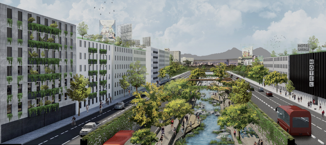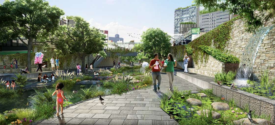 Este proyecto se basa en la restauración de Cheonggyecheon, en Corea del Sur, pues lo que se hizo fue traer de vuelta un canal a la ciudad de Seúl que había sido tapado por una autopista, ya que a pesar de beneficiar a 160 mil automovilistas todos los días, la vialidad ya era obsoleta y su mantenimiento tenía un costo muy alto.