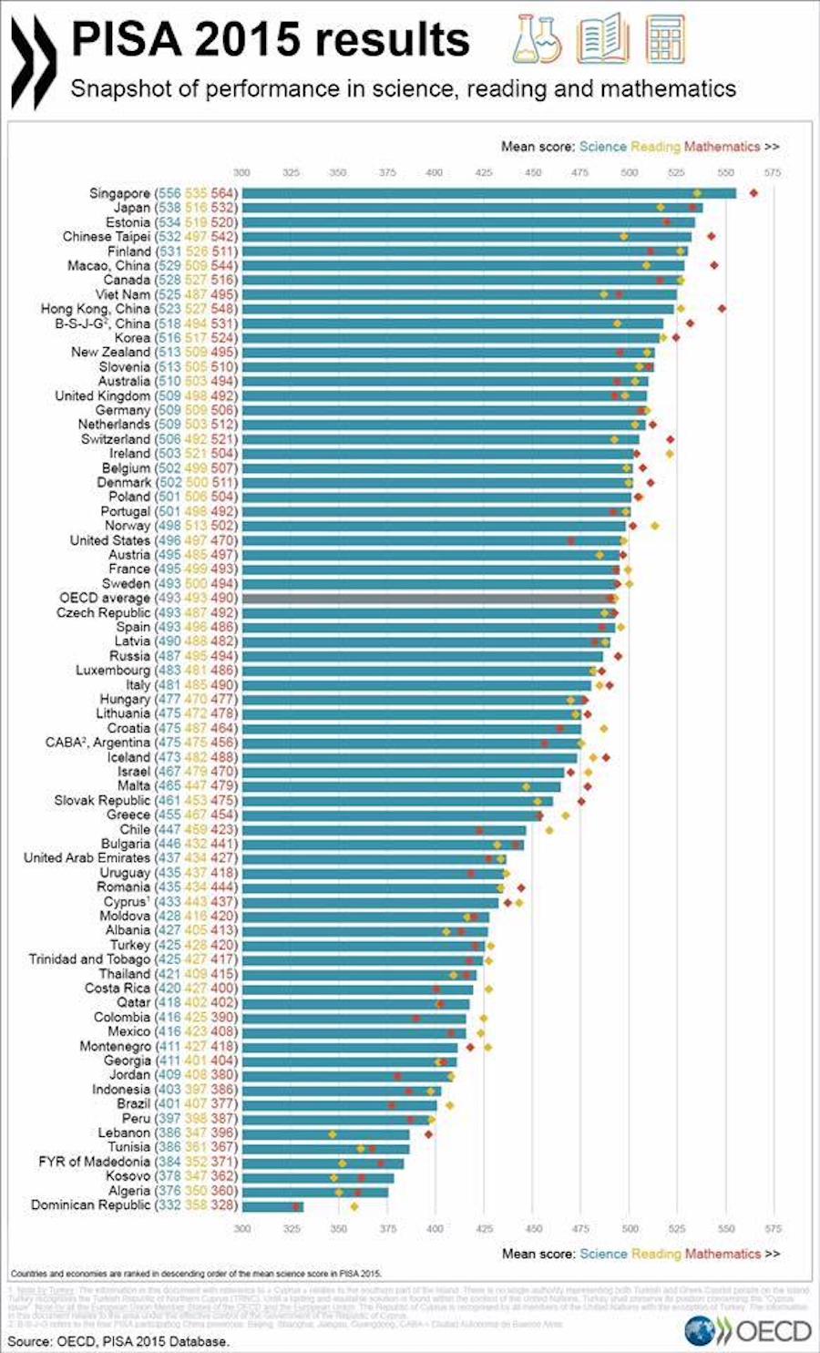 Un dato más: dado que los jóvenes que respondieron a PISA 2015 tenían entre 15 y 16 años en el momento de tomar la prueba, estos resultados dan cuenta del aparente fracaso de lo hecho con Fox y Calderón. Quizás, sin necesariamente retirar la actual reforma educativa -que tiene elementos necesarios- deberíamos cambiar nuestras expectativas sobre sus posibles resultados en el futuro; y complementarla con los ajustes necesarios a la luz de la turbulenta implementación que hemos notado en los últimos años, con políticas públicas que se desenfoquen de exámenes de maestros, tablets y cambios curriculares (que ya viene otro). Por ejemplo, invertir en guarderías para la primera infancia, cuando los niños necesitan desarrollar más sus habilidades cognitivas; o trabajar en procesos educativos mucho menos espectaculares como cambiar prácticas de enseñanza en las escuelas con padres, maestros, niños y directivos.