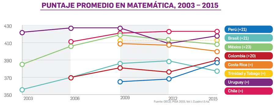 Entonces, hay tres maneras en que podemos interpretar los datos, en comparación con otros países: compararnos con los países miembro de la OCDE, organización a la que pertenecemos y que realiza la prueba, compararnos con nuestra región (América Latina) y compararnos con nosotros mismos en el tiempo.
