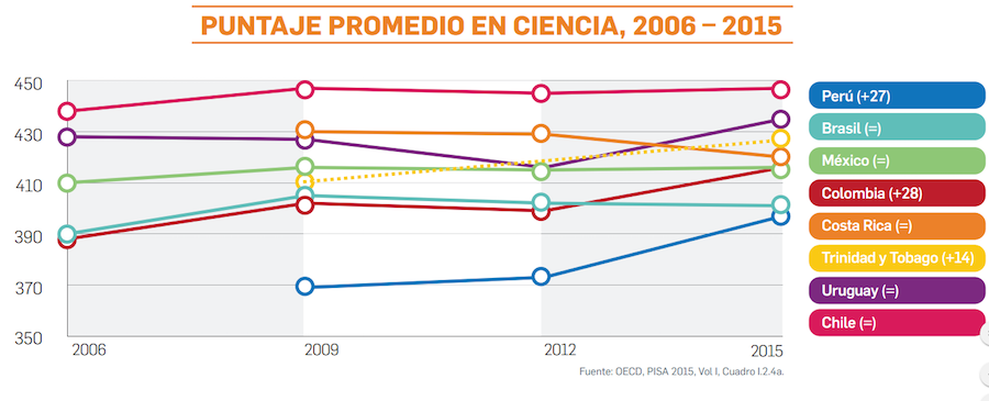 Gráfica 3.- Puntaje promedio en ciencia para países de América Latina de 2006 a 2015.