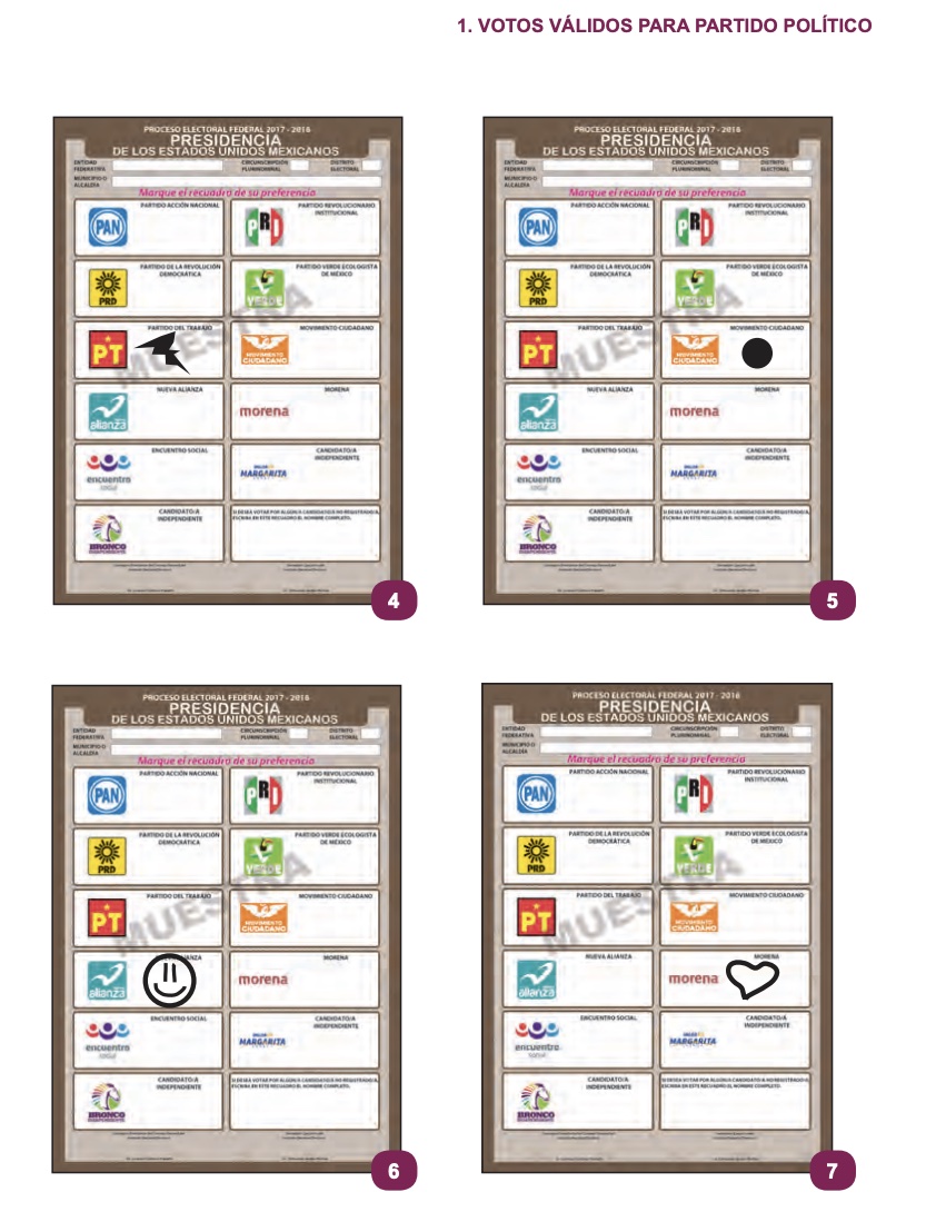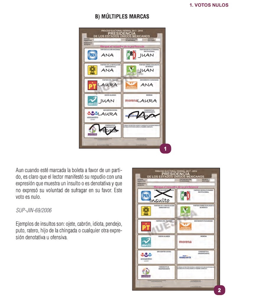 Tu voto también puede ser anulado si hay marcas en toda la boleta o haces múltiples marcas en los recuadros cuando no se trata de una coalición, escribes insultos, seleccionas más de un recuadro de los partidos opositores o ya de plano no eres claro con tu intención. Aquí unos ejemplos: