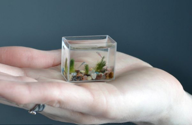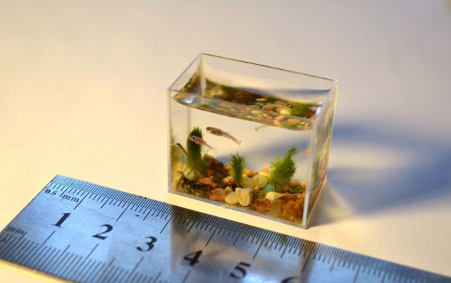 Resulta que un ocioso en alguna tarde ociosa decidió fabricar un acuario miniatura; mide 30 mm de ancho por 24 mm de profundidad y 14 mm de alto.