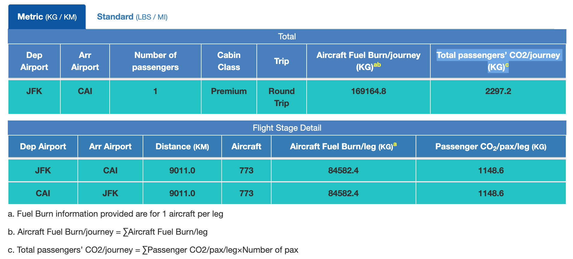 Por un viaje de ida y vuelta, en primera clase, para una persona, saliendo del aeropuerto John F Kennedy, en Nueva York, Estados Unidos, y llegando a El Cairo, en Egipto, tenemos una emisión de 2 mil 297.2 kilogramos de CO2 por pasajero.