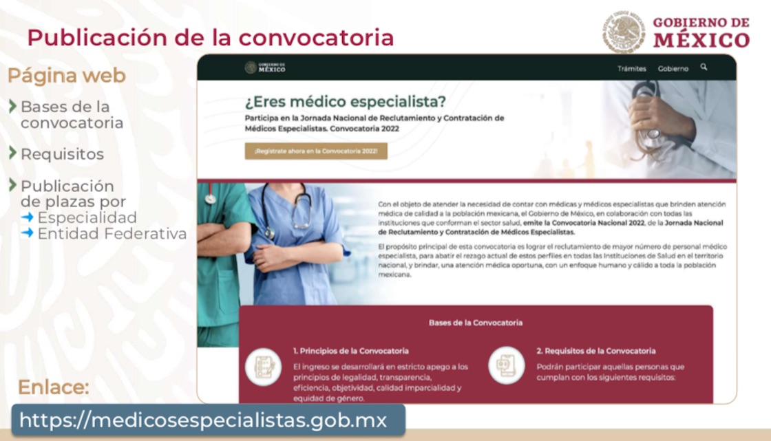 El objetivo de esta convocatoria es poder reclutar el mayor número de médicos y medias especialistas para terminar con el rezago o la falta de cobertura de plazas en estas instituciones de salud pública.