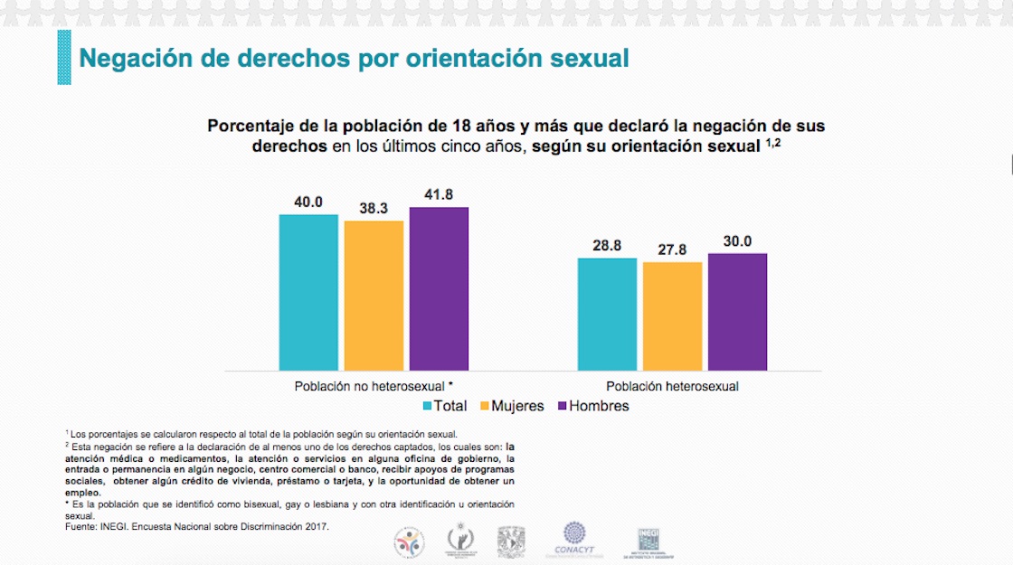 De acuerdo con la ENADIS 2017 (Encuesta Nacional sobre Discriminación), 40% de la población no heterosexual mayor de 18 años consideró que sus derechos les fueron negados solo por su orientación sexual.