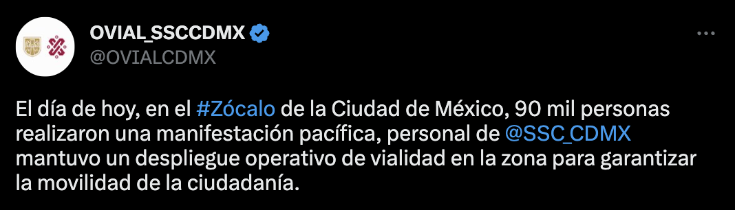 De acuerdo con la Secretaría de Seguridad Ciudadana de la Ciudad de México, a la Marcha del INE asistieron 90 mil personas. “Se mantuvo un despliegue operativo de vialidad en la zona para garantizar la movilidad de la ciudadanía”, explicaron brevemente.