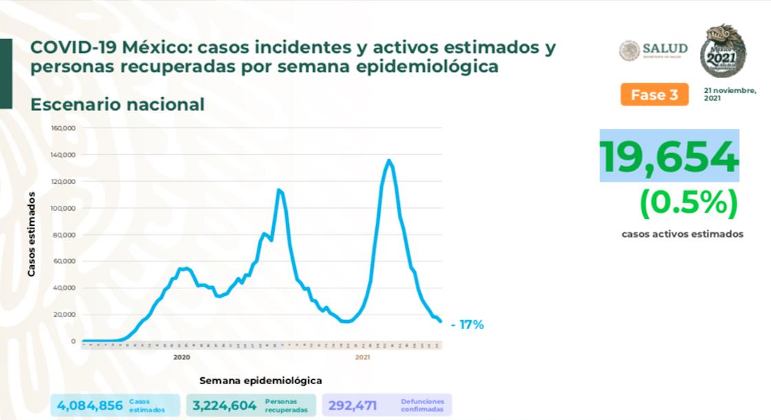 Según los datos de la Secretaría de Salud, los registros de casos activos estimados para el 17 de noviembre fueron de 19 mil 654, el 18, de 20 mil 115, el 19 de 20 mil 756 y el 20 de noviembre, de 21 mil 189.