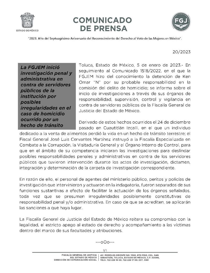 Ese mismo jueves 5 la Fiscalía mexiquense dio a conocer que abrió una investigación penal y administrativa contra agentes del Ministerio Público, peritos y policías de Investigación que participaron en el dictamen y elaboración de la carpeta del caso de Jorge Claudio.