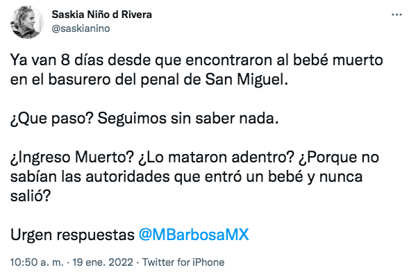El pasado lunes 10 de enero, el cuerpo de un bebé de aproximadamente 3 meses fue encontrado en la basura del penal de San Miguel, que se encuentra en la ciudad de Puebla, estado de Puebla. De acuerdo con la Fiscalía estatal, el menor tenía una cirugía en el abdomen y según la presidenta de Reinserta, Saskia Niño de Rivera, el bebé entró al penal en una visita familiar.