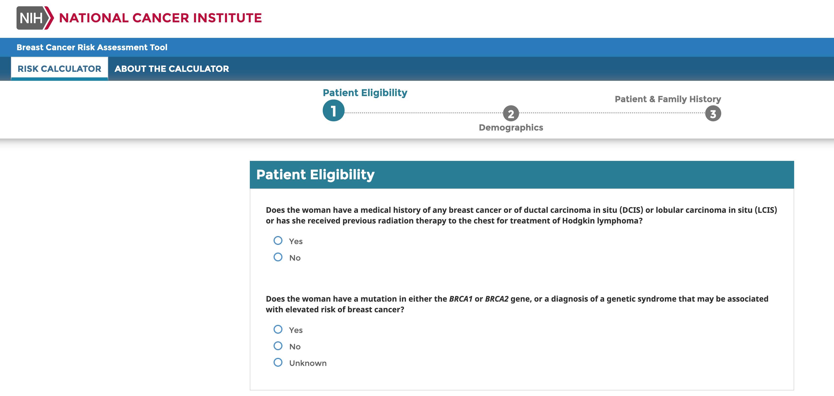 Bueno pues el Breast Cancer Risk Assessment Tool está disponible de manera gratuita en la página web del National Cancer Institute de Estados Unidos (NIH).