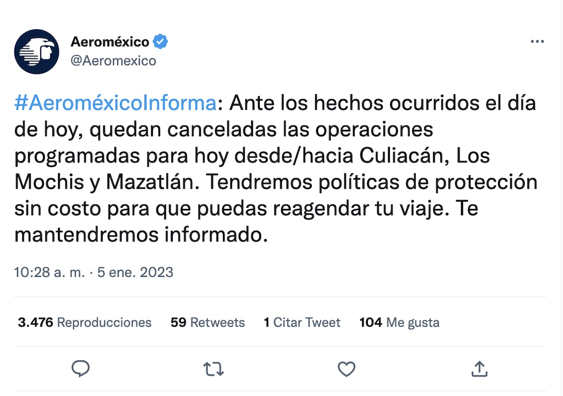 Por su parte, Aeroméxico avisó que todas las operaciones programadas este 5 de enero desde y hacia Culiacán, Los Mochis y Mazatlán están canceladas.