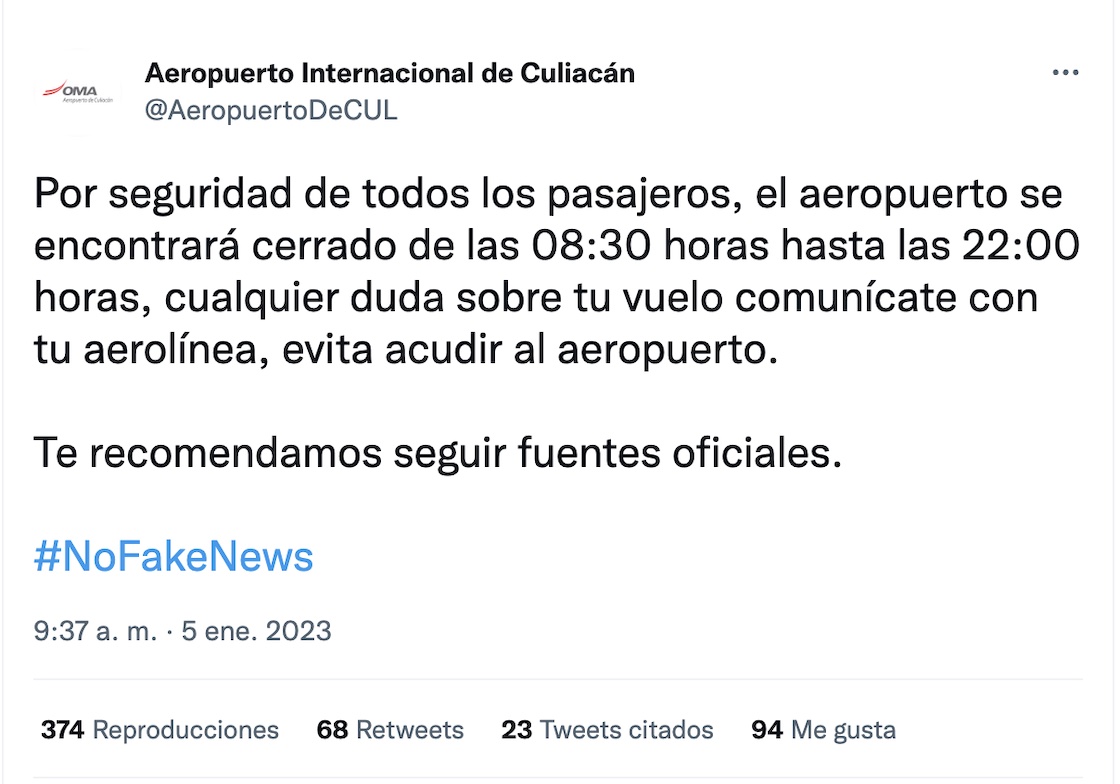 Lo que es un hecho, es que los vuelos y toda actividad fueron suspendidos, desde las 8:30 de la mañana a las 10 de la noche —mientras que desde Los Mochis hasta Culiacán se registran bloqueos y balaceras, en medio de un operativo de las autoridades estatales y federales.