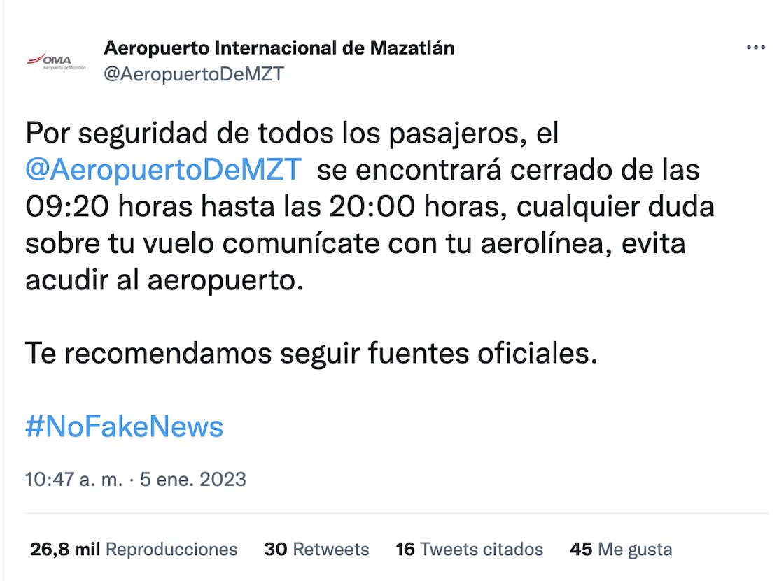 Acá el mensaje compartido en redes: “Por seguridad de todos los pasajeros, el aeropuerto se encontrará cerrado de las 08:30 horas hasta las 22:00 horas, cualquier duda sobre tu vuelo comunícate con tu aerolínea, evita acudir al aeropuerto. Te recomendamos seguir fuentes oficiales”.