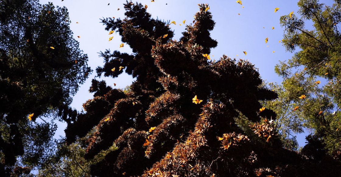 Acá, en la Reserva de la Biosfera Mariposa Monarca, en el estado de Michoacán, las mariposas hibernarán hasta finales de febrero o mediados de marzo, pero durante el día, al salir el solecito, calientan sus alas, vuelan por todo el bosque y beben agua.