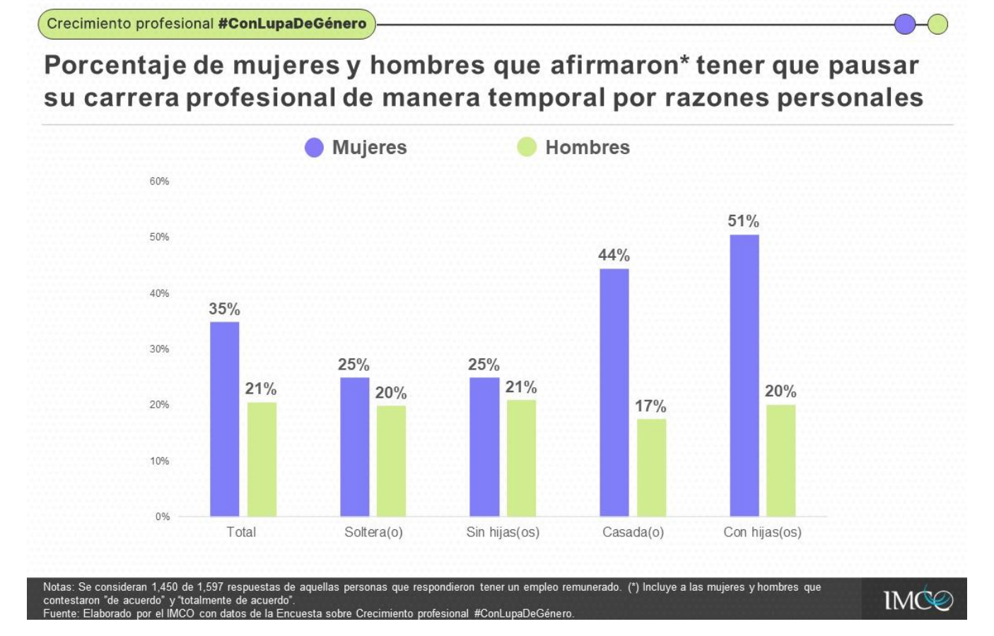 El 51% de las madres y el 44% de las mujeres casadas afirmaron haber puesto en pausa su carrera profesional por movidos personales. Pero si hablamos de hombres que son padres o que están casados, los porcentajes disminuyen en 20 y 17% respectivamente.