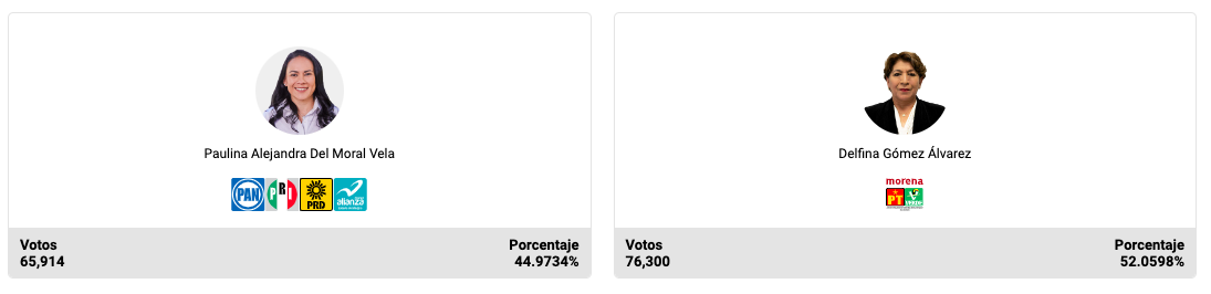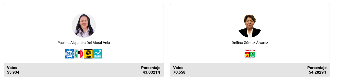 Y acá también ganó la candidata de Morena. Delfina Gómez se llevó 88 mil 488 votos, es decir, el 53.44%, mientras que Alejandra Del Moral se quedó con un 43.26%, lo que representa 71 mil 633 votos.