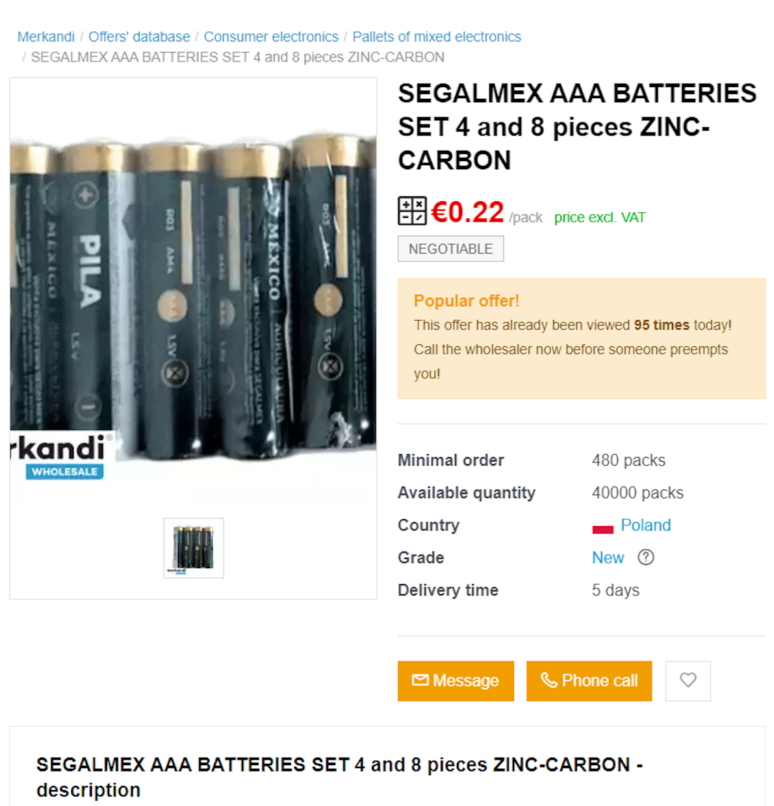 Es justo en su página de ventas por internet al mayoreo, que ellos afirman que tienen unos 40 mil conjuntos de baterías a un precio unitario de 0.2 euros (alrededor de cuatro pesitos).