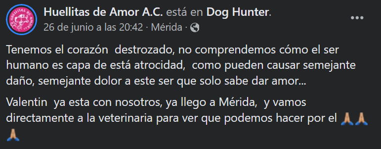 “Comerse un huevo no debería ser motivo para tratar a los animales así… El perrito Valentín fue víctima de dos bestias, todo por comerse un huevo. Un par de mujeres le rociaron gasolina sobre la cabeza y prendieron fuego (…) Nadie quería atenderlo, no podíamos dejarlo a su suerte y decidimos ir por él. Fue un día muy largo y cansado… pero Valentín ya esta con nosotros”.