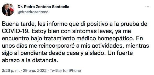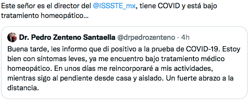 A través de su cuenta de Twitter, donde Zenteno Santaella dio a conocer la noticia, el médico cirujano por el Instituto Politécnico Nacional (IPN) detalló a sus seguidores que sus síntomas de coronavirus son leves y ya está bajo un tratamiento médico ¿Qué tiene eso de raro?, pues que el tratamiento que está tomando se lo receta un médico homeópata.