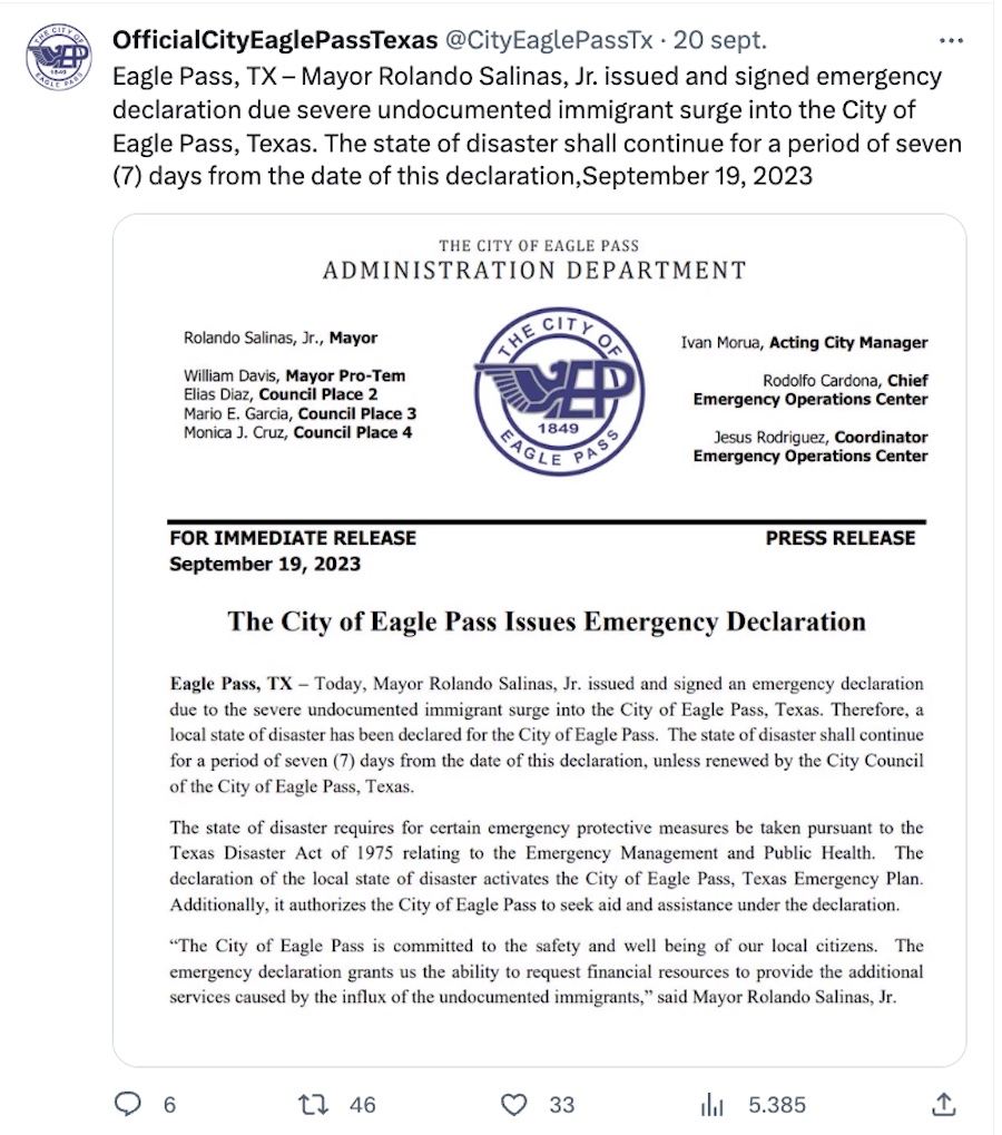 Apenas el 19 de septiembre de este 2023, el alcalde de Eagle Pass Rolando Salinas Jr firmó una declaración de Emergencia por la llegada sin precedentes de migrantes a esta ciudad fronteriza.