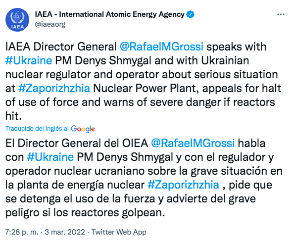 El director general del Organismo Internacional de Energía Atómica, Rafael Mariano Grossi, ya se encuentra en comunicación con el regulador y el operador nuclear de la central en Ucrania. El funcionario internacional hacer un llamado para que se detenga el uso de la fuerza y advierte sobre el peligro, grave peligro, si los reactores explotan.
