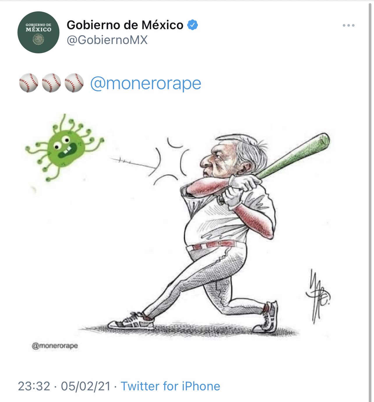 Se trata de un posteo que el Gobierno hizo hace unas horas en su cuenta de Twitter (y que por supuesto ya bajaron) en donde a través de un cartón realizado por el periodista y caricaturista Rafael Pineda, mejor conocido en internet como monero Rapé, se ve a AMLO bateando a un coronavirus, dando a entender que el presidente de México venció al COVID-19 y lo mandó muy lejos.