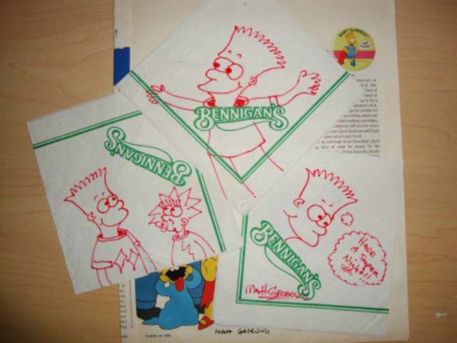 Los dibujos están en manos de un joven que jura y perjura que fueron hechos por el mismísimo Matt Groening hace más de 20 años. Según cuenta, su madre trabajaba en un restaurante hasta donde un día llegó Groening. Cuando la mesera le pidió un autógrafo, él dibujó a los entonces desconocidos personajes en una servilleta del restaurante.