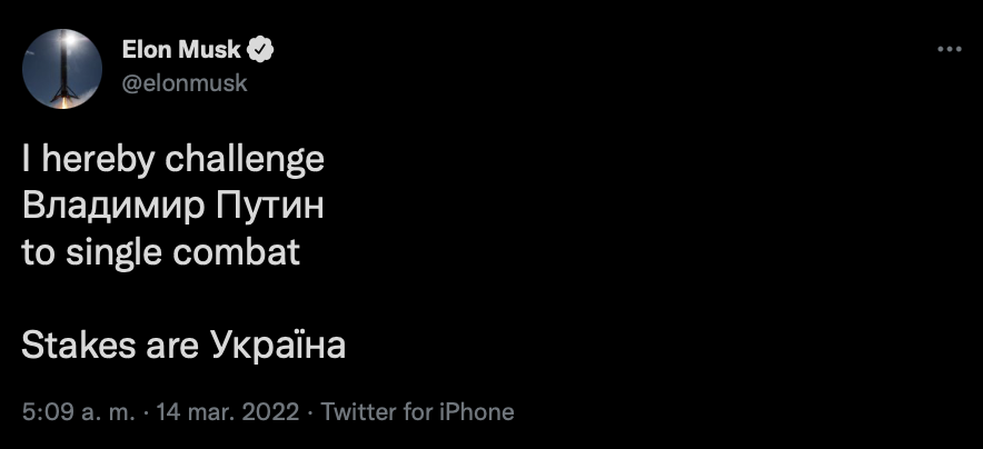 “Вы согласны на этот бой”, preguntó el hombre detrás de Tesla y SpaceX en un mensaje que, según la traducción de Twitter, solamente les preguntaba si querían organizar los catorrazos contra Putin oficialmente.