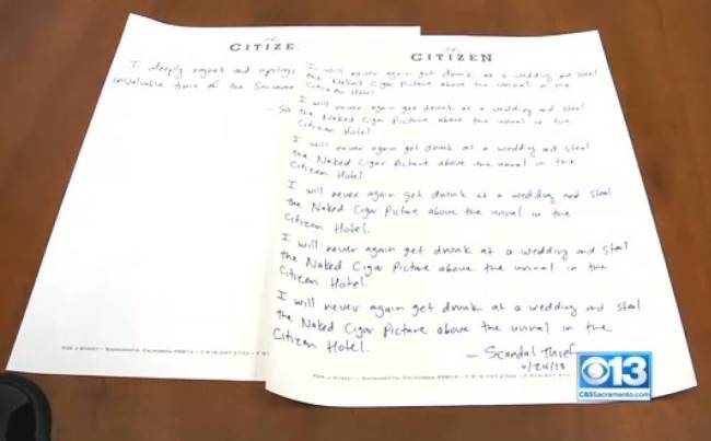 “No volveré a emborracharme y robar el cuadro de la mujer desnuda sobre el cigarro que está arriba del urinal en el Hotel Citizen”.