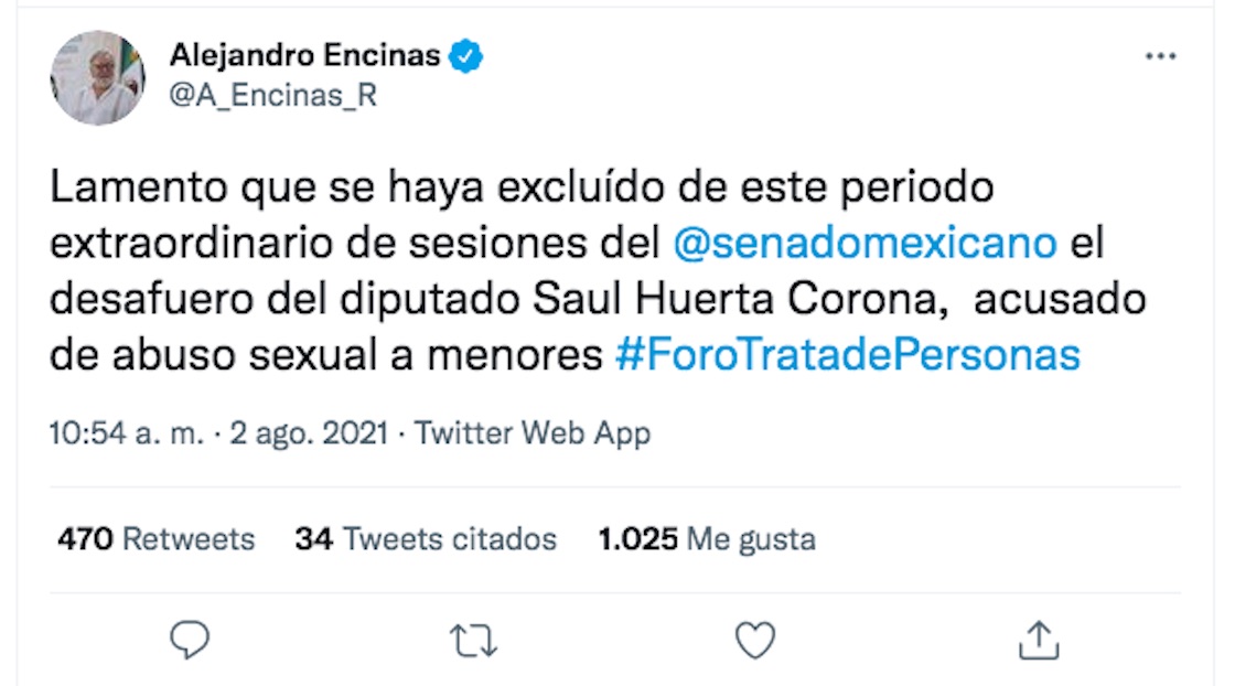 Lo cierto es que el comentario de Alejandro Encinas es secundado por tuiteros y tuiteras, desde abril se espera el desafuero de Saúl Huerta, su caso ha pasado por la Sección Instructora de la Cámara de Diputados hasta la Comisión Permanente del Congreso, que justo el 29 de julio rechazó incluir en el periodo extraordinario el desafuero de Saúl Huerta y Mauricio Toledo, del Partido del Trabajo.