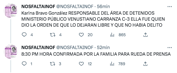 “Convocamos a los medios y a la comunidad en Isabel la Católica 185 para rueda de prensa y hacer presión porque parece que quieren dejar libre a esta persona”, se leía en el tuit donde daban más información de Inof, a quien encontraron descalza en un predio de la colonia Moctezuma.
