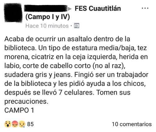 Algunos alumnos comenzaron a publicar las características de esta persona en redes sociales para advertir a toda la comunidad. Aseguraron que fingió ser un trabajador de la biblioteca que les pidió ayuda y después se llevó 7 celulares.
