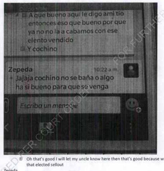 –Zepeda contesta: “Jajaja lo de hermoso se lo paso porque yo se que si estoy jaja pero muñecote jaja Pero no se preocupe, esa gente va por ustedes pero no pisaran ninguna cárcel por ningún motivo simplemente nadie sabrá de ustedes jaja no se crea estoy bromeando usted empezó a bromear y se aguanta”.