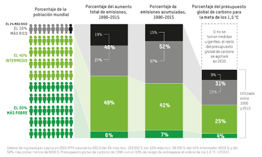 Entrar en márgenes de seguridad climática requiere de cambios profundos en la forma de vida de nuestras sociedades a lo largo y ancho del planeta. Esto implica cambiar la forma en que generamos y utilizamos la energía, el modo en que nos transportamos, lo que comemos y de dónde lo obtenemos, así como los productos que consumimos y nuestra relación con los bosques y selvas de la Tierra. A su vez, implica terminar con desigualdades aberrantes en las que un pequeño porcentaje de la población dilapida recursos en detrimento del resto de la humanidad. De acuerdo con Oxfam Internacional, el 10% más rico de la población mundial es responsable del 50% de las emisiones totales de GEI.
