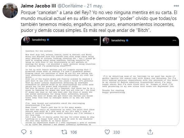 “Ahora que Doja Cat, Ariana, Camila, Cardi B, Kehlani y Nicki Minaj y Beyoncé han tenido el número uno con canciones sobre ser sexy, no llevar ropa, follar, engañar, etc. ¿Puedo por favor volver a cantar sobre sentirme bella estando enamorada aunque la relación no sea perfecta, o bailar por dinero sin ser crucificada o decir que estoy glamorizando el abuso?” escribió Lana en una carta que le trajo bastantes señalamientos en redes. Así se abrió la discusión sobre ella, con gente a favor de sus declaraciones y detractores por todos lados.