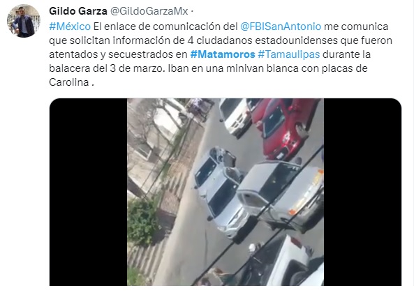 El secuestro de los ciudadanos estadounidenses se habría dado en estos hechos. Al parecer, corresponde con un video que circula en redes, en la que se ve que personas armadas suben a una mujer una camioneta blanca. Los mismos arrastran a personas heridas, para luego subirlas junto a la mujer.