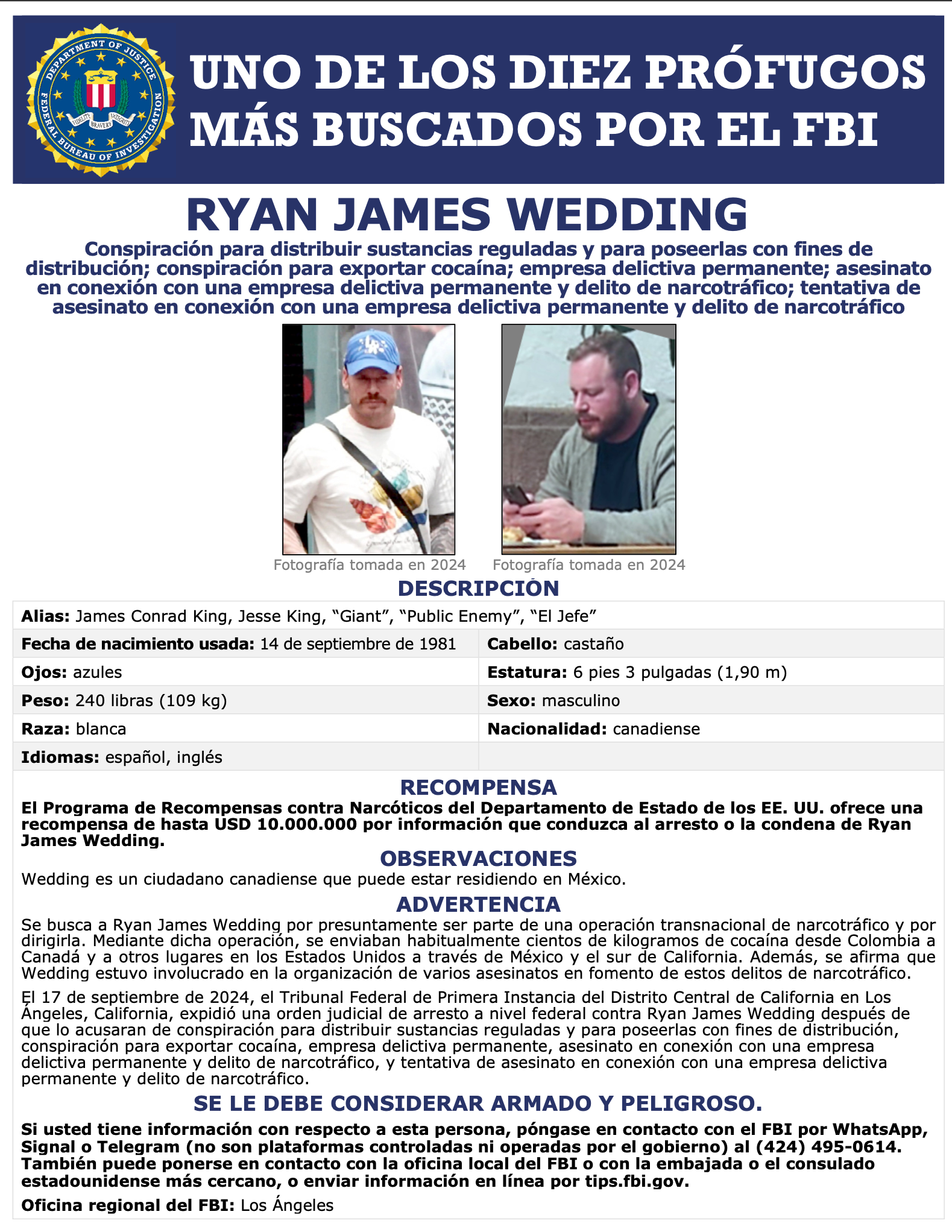 “Se busca a Ryan James Wedding por presuntamente ser parte de una operación transnacional de narcotráfico y por dirigirla. Mediante dicha operación, se enviaban habitualmente cientos de kilogramos de cocaína desde Colombia a Canadá“.