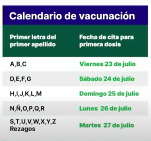 Para el caso de las personas que tienen entre 30 y 39 años y viven en las alcaldías Álvaro Obregón y Venustiano Carranza, la vacunación arrancará unos días después. También se hará de acuerdo a la inicial del primer apellido, pero será del viernes 23 de julio y hasta el martes 27. Te dejamos a continuación el calendario: