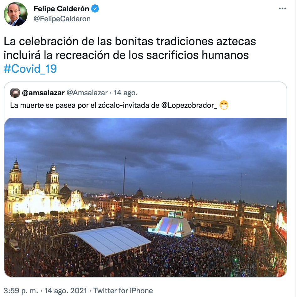 “La celebración de las bonitas tradiciones aztecas incluirá la recreación de los sacrificios humanos”, escribió Calderón en un tuit donde agregó el hashtag #COVID_19, enfermedad que nomás parece preocuparle cuando son los demás quienes salen de casa, pues él por alguna razón sí puede andar en eventos y sin cubrebocas.