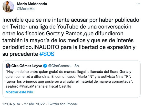 “Increíble que se me intente acusar por haber publicado en Twitter una liga de YouTube de una conversación entre los fiscales Gertz y Ramos,que difundieron también la mayoría de los medios y que es de interés periodístico.INAUDITO para la libertad de expresión y su precedente”, respondió el periodista Mario Maldonado.